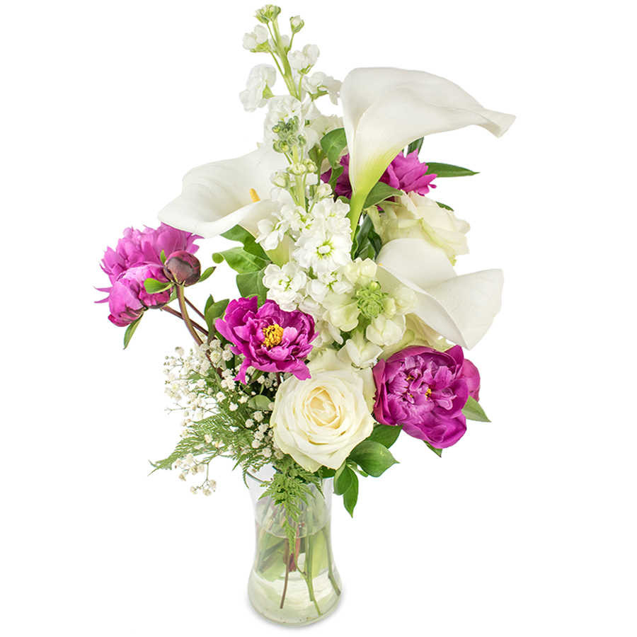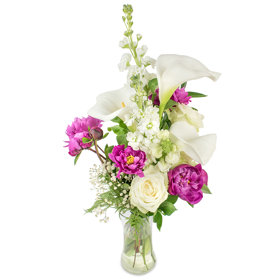 Introducing our Delightful Purple Peony and Calla Lily Bouquet, a harmonious blend of vibrant Purple Peonies and graceful White Calla Lilies. Enhanced with White Roses, Stock Flowers, and soft Gypsophila, this bouquet offers a perfect balance of color and elegance.